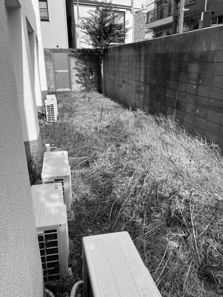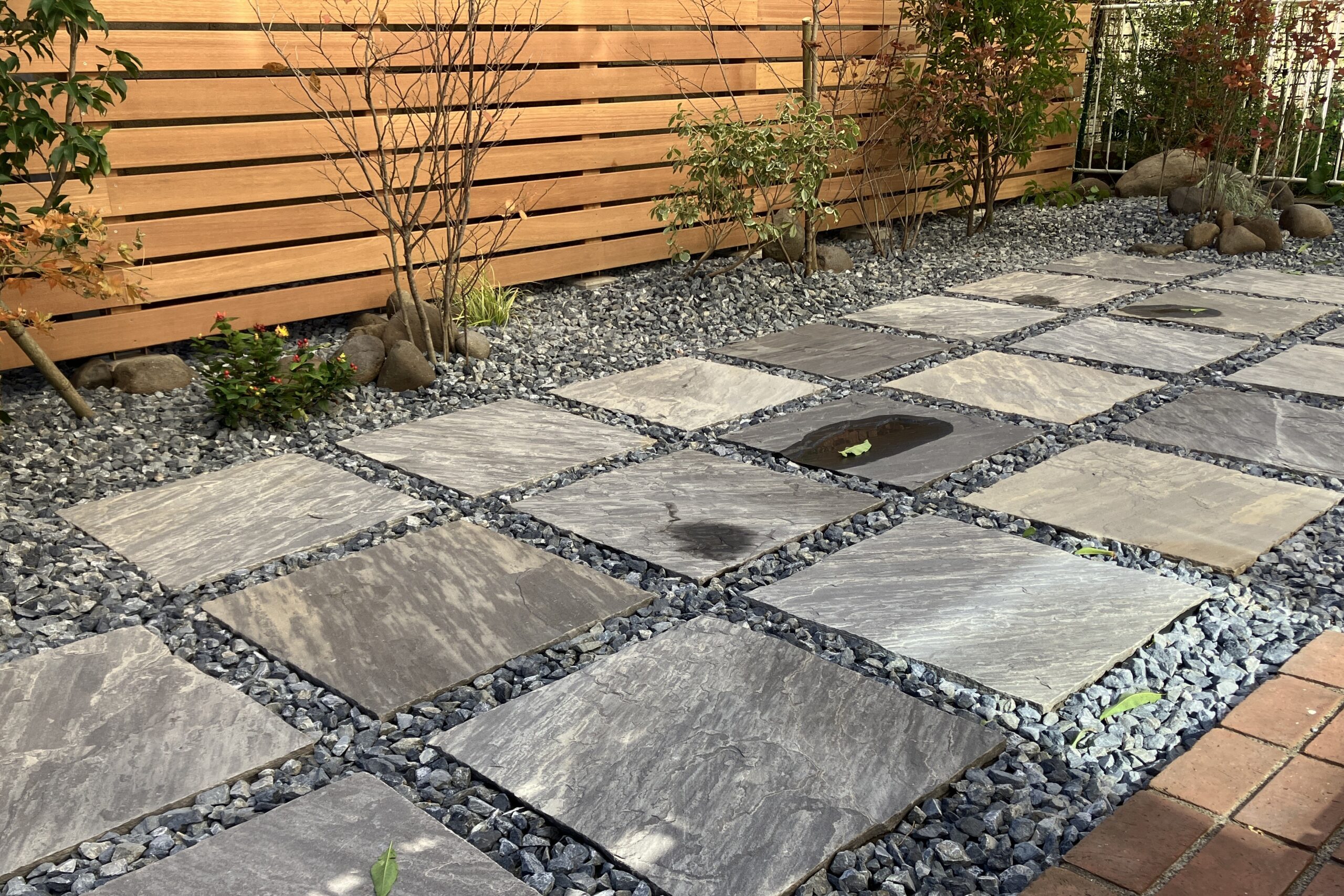 雑草対策としては、防草シート+砂利+石材平板を組み合わせ、すっきりとしたシンプルなデザインに。 機能性と景観の両立を図っています。