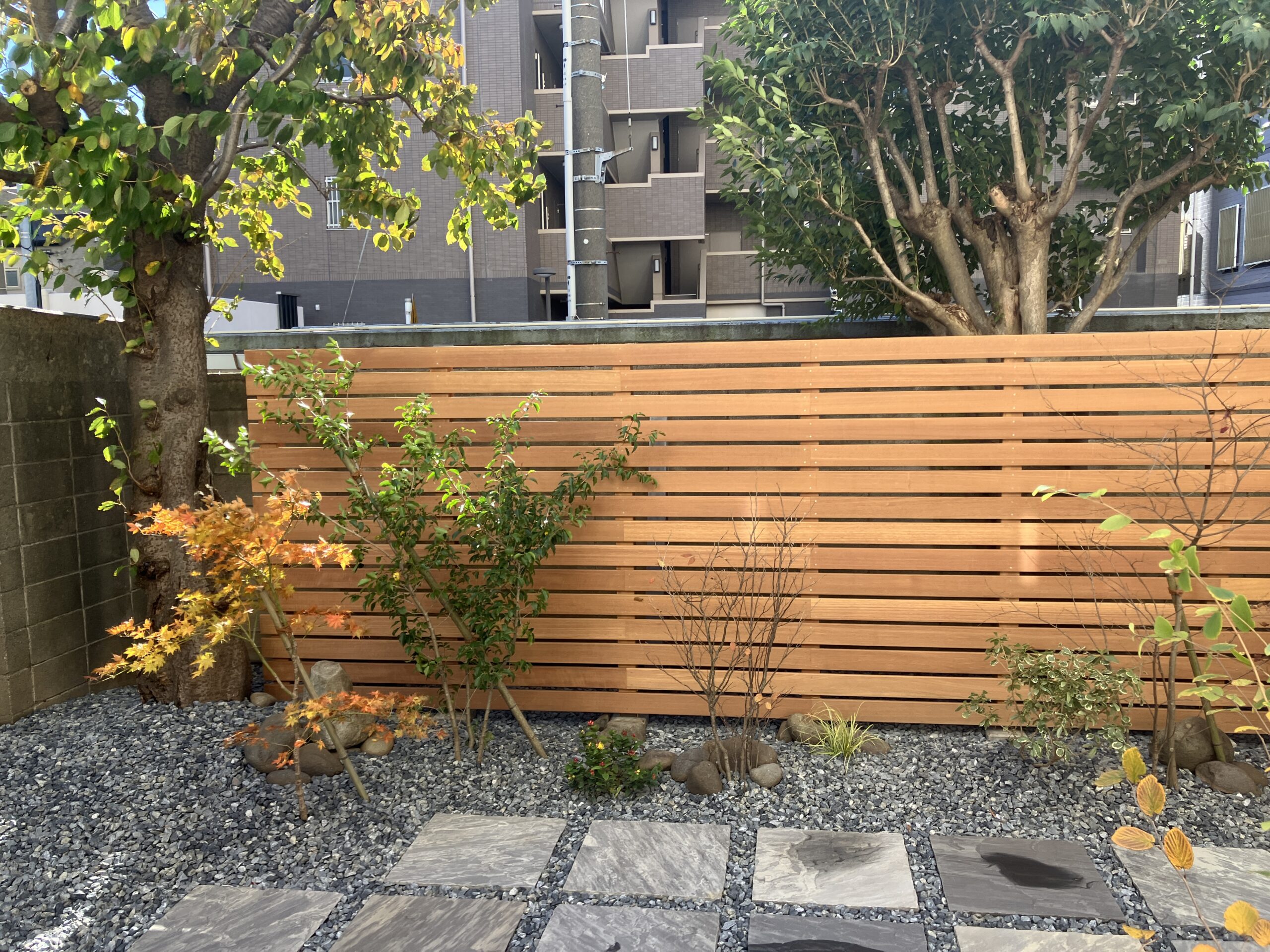 そこで、ブロック塀を目隠しするためにハードウッドのフェンスを設置。 既存の高木を活かしながら、四季の葉や花を楽しめる低木を中心に植栽をご提案いたしました。